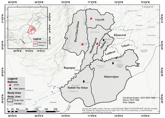 In this study, we used daily observed PMD and ERA reanalysis datasets for temperature and precipitation. Daily observed data from 1985 to 2015 were acquired for three stations, i.e., Multan, Rahimyar Khan and Bahawalpur, from the PMD. We considered two reanalysis datasets (i.e., ERA5 and MERRA-2) for three data-sparse districts, i.e., Muzaffargarh, Layyah and Dera Ghazi Khan. Two major crop seasons were selected in the six selected districts of Southern Punjab. The first season was Kharif, in which cotton sowing begins in May and is harvested in October. The second one was Rabi, in which wheat sowing starts in November and is harvested in April.