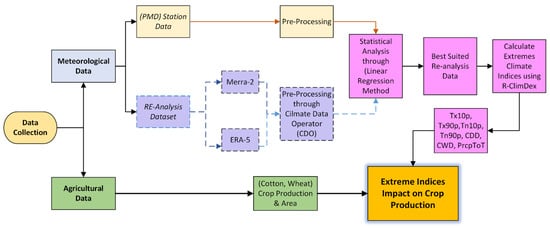 Threshold criteria were carefully chosen to calculate required indices from daily precipitation and temperature (max and min) data for both seasons and all districts in Southern Punjab (Table 4). The selected threshold values are explained in Table 4. The whole methodology is described schematically in Figure 2.