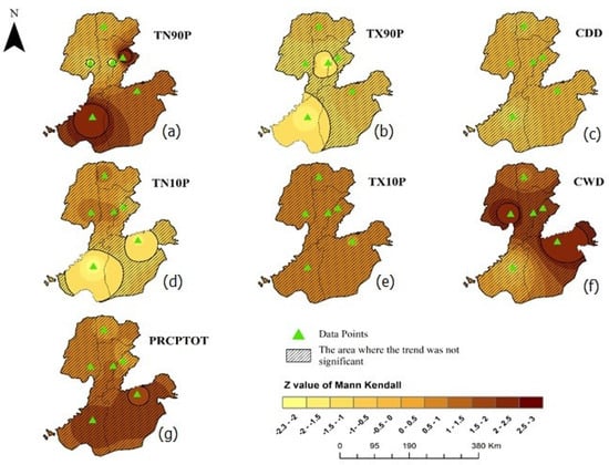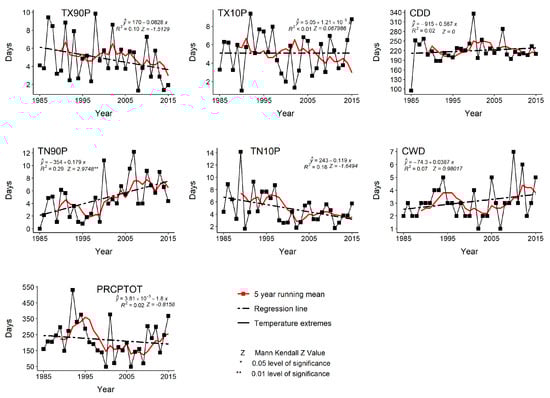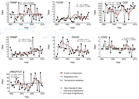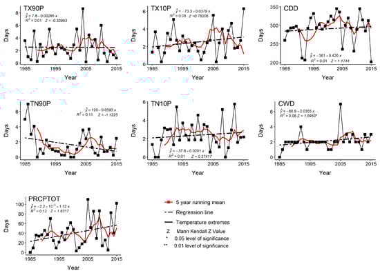 After the calculation of extreme indices, we additionally used a non-parametric Mann–Kendall test for trend analysis of each district for data that were less sensitive to outliers and did not follow a normal distribution []. The Z value was used to find a trend’s direction. A Z value less than zero indicates a downward trend and Z values greater than zero indicate an upward trend. A higher significance in the trend indicates a higher Z value. Absolute values of Z that are greater than 1.96 show that the trend is significant at the α = 0.05 level. Based on the Mann–Kendall test, a Z value greater than 3.30 indicates significance at α = 0.001 and Z values greater than 2.58 show significance at α = 0.01 []. Moreover, a linear regression was used to analyze the specific relationships between two or more variables by fitting a linear equation to the observed data.