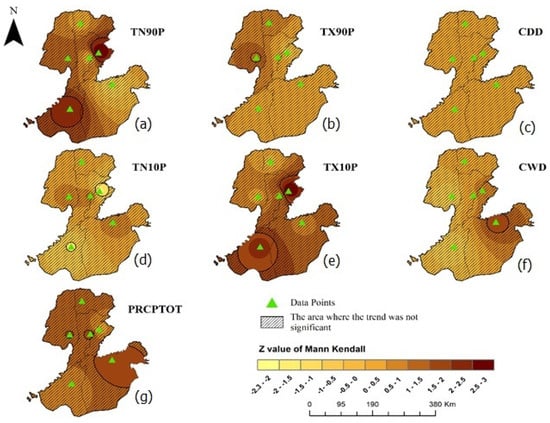 Spatial distribution of the Mann–Kendall test for extreme indices of Kharif season at different data points in the study area.
