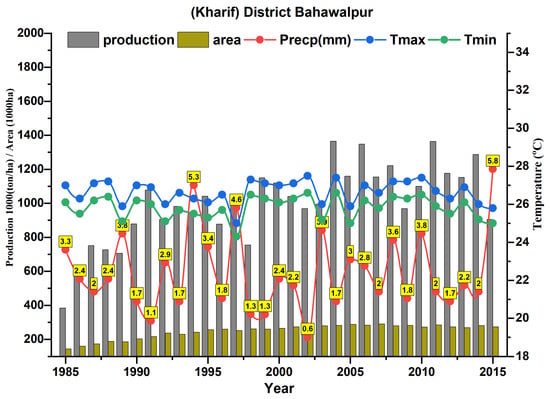 Seasonal mean variation in temperature, precipitation and crop production for Kharif season in Bahawalpur district.