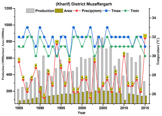 Seasonal mean variation in temperature, precipitation and crop production for Kharif season in Muzaffargarh district.