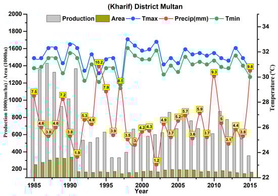 Seasonal mean variation in temperature, precipitation and crop production for Kharif season in Multan district.