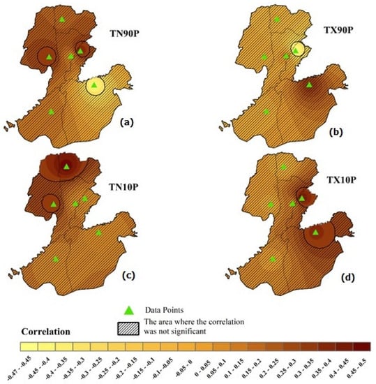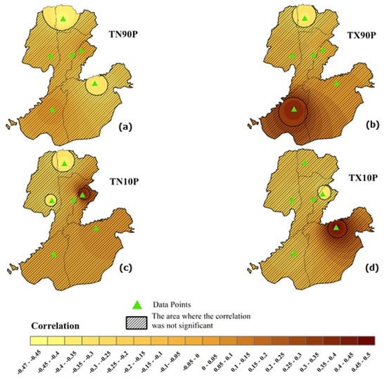 Spatial distribution of correlation coefficient between extreme indices and cotton crop for Kharif season.