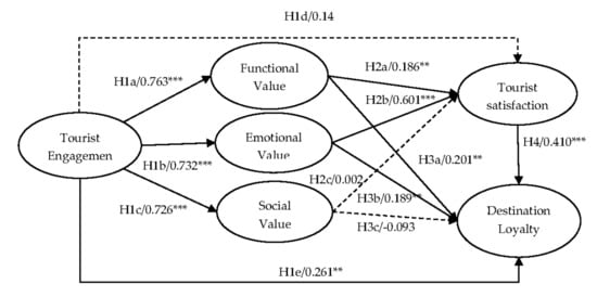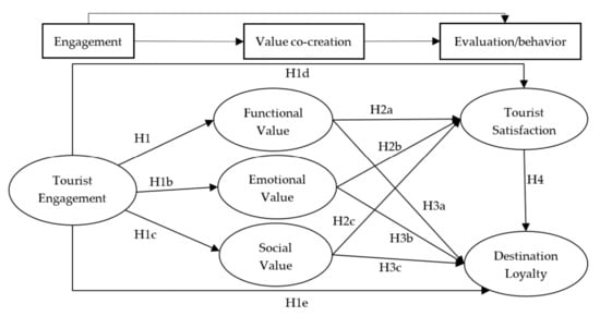 Research conducted on the direct relationship between engagement and the dimensions of perceived value is currently lacking. However, relevant research indicated that CE has a positive impact on the perceived quality and the price of tourism-related services [17,34]. In addition, Hollebeek [46] showed that hedonic brand engagement enhanced brand users’ symbolic value (including social value), experiential value, self-image, and self-value. Furthermore, engagement, based on its relational foundations of interactive experience and value co-creation [4], will probably affect tourists’ functional value, emotional value, and social value positively through their co-creating experiences with the destination [47]. Empirical studies also demonstrated that the active interactions among tourists positively affects their functional value, emotional value, and social value [48]. Based on the above analyses, the following hypotheses are proposed.