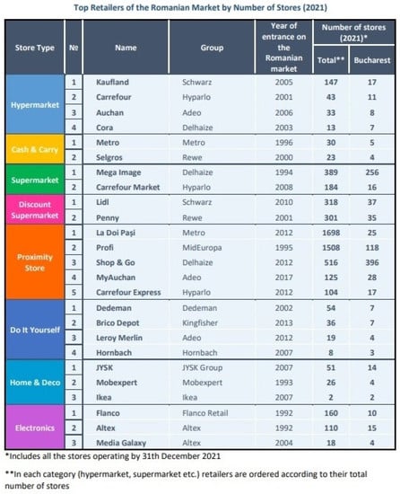 - Romanian Distribution Committee. Top Retailers of the Romanian Market by Number of Stores (2021). Romanian Distribution Committee News. 12 January 2022. Available online: https://www.crd-aida.ro/2022/01/top-retailers-of-the-romanian-market-by-number-of-stores-2021/ (accessed on 12 December 2021).
