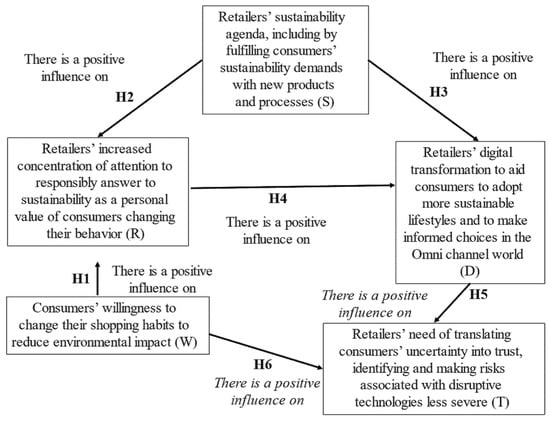 An under-explored area in the research literature is that concerning how a sustainable product and sustainable consumption are working together from the point of view of retailers, by taking into account what consumers are thinking, feeling, saying, doing, and experiencing, considering them as co-creators in sustainable product development. Therefore, we investigated the extent to which there is a positive influence of retailers’ sustainability agenda (including by fulfilling consumers’ sustainability demands with new products and processes) on retailers’ increased concentration on responsibly answering to sustainability as a personal value of consumers (changing their behavior) and on retailers’ digital transformation to aid consumers to adopt more sustainable lifestyles and to make informed choices in the omnichannel world.
