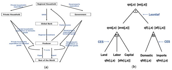 Figure 1a is a schematic of the standard GTAP model’s overall structure, and Figure 1b shows the structure of the production sector. The model has a structure in which six economic agents (regional household, private household, government, producer, global bank, and rest of the world) interact with each other. The solution to the model, based on Walras’s general equilibrium theory [25], is derived from the optimization activities of each agent, including profit maximization, cost minimization, and utility maximization.