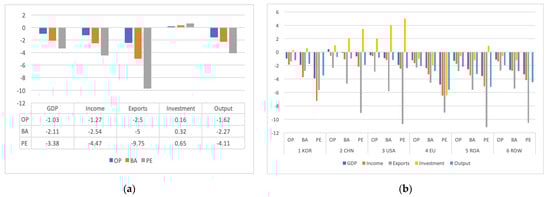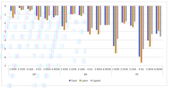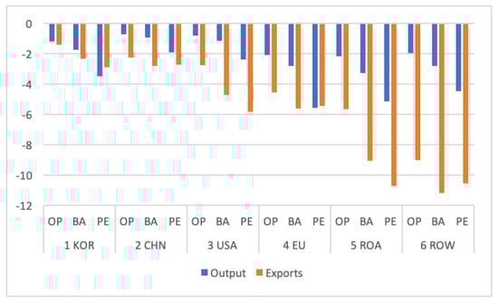 As for exports, regions other than KOR and the EU showed similarly large declines in exports, among which the USA generally showed the largest reduction rate. Under OP, all regions’ exports decreased by less than 3%, whereas under PE, all regions’ exports decreased by around 10%, except KOR’s exports. KOR showed substantially lower reductions in exports than the other regions, ranging from −1.4% to −5.64% depending on the scenario.