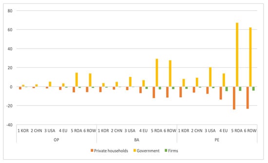 The GTAP model divides expenditure by economic agent and further classifies it into expenditure on imported goods and on domestic goods. Firm expenditure is divided into three categories, including not only goods, but also factors of production. Figure 3 is a graph segmenting the rate of change in expenditure within each region by economic agent. Details can be found in Appendix B. Firm expenditure includes only expenditure on goods, excluding the expenditure on factors of production. In all scenarios and regions, government expenditure increased, while household and firm expenditure decreased, with the decline in household expenditure exceeding that of firm expenditure. In terms of regional averages, under BA, household expenditure dropped by 7.7% and firm expenditure by 1.89%, while government expenditure increased by approximately 15%. Within the classified groups, the USA’s reduced rate of expenditure exceeded that of CHN despite applying the same level of shock, the EU’s reduced rate of expenditure was greater than that of KOR, and the ROA showed a higher rate of expenditure than the ROW. The rise in government expenditure can be attributed to two factors: the economic recession and increased export tax. Economic downturns during the COVID-19 pandemic stimulate government spending to recover the economy by boosting reduced private consumption and providing various forms of financial support. Meanwhile, the increased export tax applied as an economic shock raises the government’s tax revenue, which encourages expenditure or compels the government to pay subsidies. Consequently, the rise in government expenditure can be attributed to the export tax increase shock and overall economic downturn. In addition, this result differs depending on the region’s economic conditions and export structure.