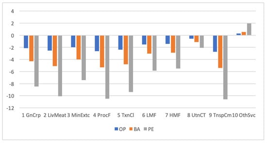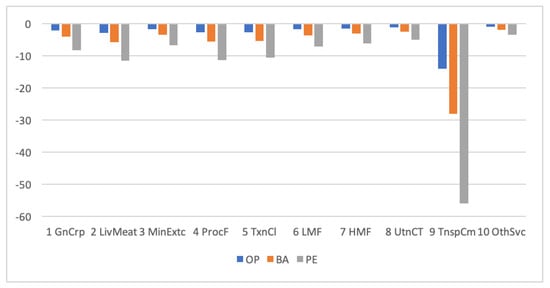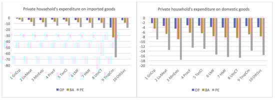 In Figure 7, output declined in all industries except “Other Services.” Tourism showed the largest decline in output at 10.59% under PE, while “Transportation and Communications” showed the smallest decline at around −2%. The decrease in tourism output can be attributed to the steep decline in the industry’s export sales and the drop in international transportation service exports. Notably, in contrast to the other industries, “Other Services” did not show a decline, although the increase was not large. The rise in this sector’s output can be attributed to a substantial increase in government sales compared to the slight decrease in export sales. Under BA, export sales in “Other Services” declined by only about 2%, whereas government sales rose by about 15%. Consequently, the rise in government sales more than offset the drop-in export sales and sales economic agents, which explains the increase in “Other Services” output.
