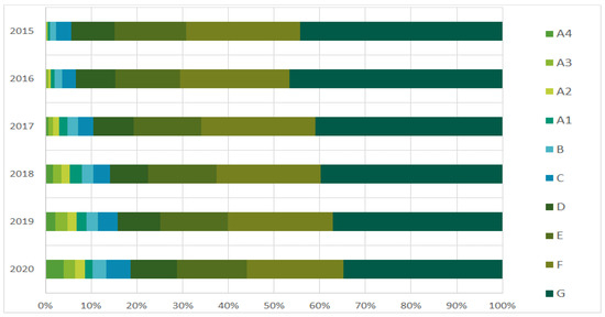 The data set contains the energy-related technical information on buildings, as reported in more than 1 million EPC released in Lombardy since 2015. It includes all the buildings classified into three classes (single unit, group of units, a whole building). The EPC can be released for different reasons, mainly related to regulatory obligations: in Lombardy “property transfer” accounts for the majority of EPCs (52.2%), followed by “rent” (24.4%), “new construction” (4.4%), “energy requalification” (4.2%), “voluntary EPC” (4.2%), “major renovation” (2.5%), interventions on thermal plants and other subsidized actions (2.1%). As far as the energy efficiency classes are concerned, the following Figure 2 summarizes the evolution of energy efficiency classes of EPCs released in Lombardy each year from 2015 to 2020.