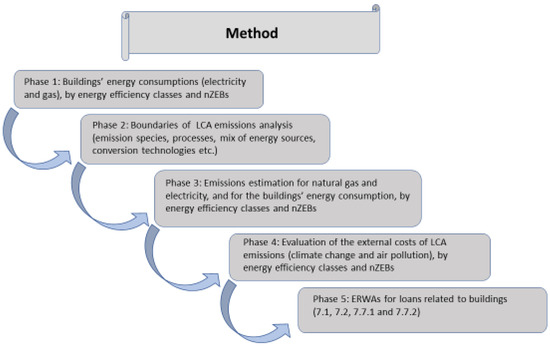 The keystone of the integration of the Taxonomy’s technical screening criteria into the ERWA approach for prudential requirements in the building/real estate sector is the energy performance certificate (EPC), introduced in 2002 (2002/91/EC) and revised in 2010 (2010/31/EU) and 2018 (2018/844/EU). In [30], it was suggested to exogenously link the ERWA values for mortgages to the EPC energy efficiency class, by assigning the ERWA minimum value of 0.5 to the Taxonomy-compliant classes and scaling the other noncompliant classes by 0.1 until reaching 1.1 for class G. In that proposal, ERWA values were still arbitrarily assigned because of the limited information on environmental and health damages included in the EPC’s energy efficiency classes (and its main indicator—primary energy consumptions). In fact, energy consumptions are responsible not only for CO2 emissions, but also for a variety of other emissions; moreover, air emissions can be related not only to the combustion phase of the energy product but also to other activities, from extraction and processing to the energy transmission and distribution network. The Taxonomy regulation itself sets the principle that a life cycle approach should be taken into account in the development of the technical screening criteria. In fact, it states this: “When assessing an economic activity against the criteria set out in paragraph 1, both the environmental impact of the activity itself and the environmental impact of the products and services provided by that activity throughout their life cycle shall be taken into account, in particular by considering the production, use and end of life of those products and services.” [5] (art. 17.2).