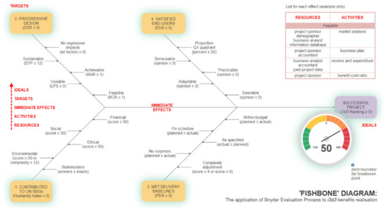 Figure 1 summarizes the model’s logic and structure. It is based on a framework created by Dick [80] from research undertaken by Wes Snyder that tracks backwards from ideals to determine targets, immediate effects, activities and resources necessary to deliver the specified ideal(s). In the case of i3d3, there is one ideal (a ‘successful project’), four targets, (namely, ‘contributed to UN SDGs’, ‘progressive design’, ‘met delivery baselines’ and ‘satisfied end-users’) and twenty immediate effects. A successful project is measured using a scale from +100 to −100, where 0 is the breakeven point between success and failure. The ideal is nominated as a value of 50 on this scale.