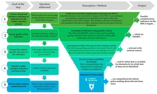 Step (5) In a final step based on the critical aspects addressed as well as the complementary indicators a broadened understanding of the challenges related to the SDG 6 targets in Austria beyond the core indicators was described and if necessary amended by relevant case-specific literature.
