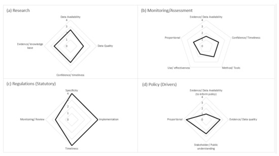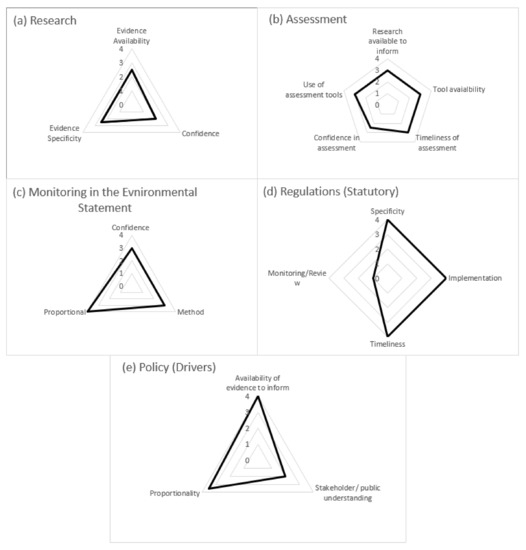 Overall, EIA processes are well established within the UK across the range of marine developments. Research was deemed reasonable for evidence availability and specificity; however, confidence in this evidence was scored low (Figure 3a). The Assessment component is generally good; however, again, confidence in the assessment was a lower score. Monitoring and regulations were scored as strong except for the element of reviewing monitoring within the regulations (i.e., learning from monitoring outputs and adapting). The low score in Figure 3d is a consequence of the regulations only being reviewed on a periodic basis—it does not mean that the regulations are weak. However, regulations are reviewed and updated as and when knowledge advances, such as the most recent update to the EIA Directive introducing the impact of climate change. The Policy was considered as strong, although public understanding could be improved (Figure 2e). So, whilst EIA in general is well established, there were some weaknesses that should be addressed to strengthen EIA as a tool.