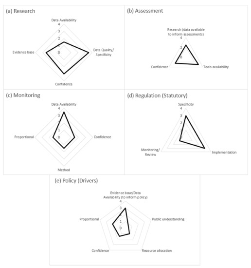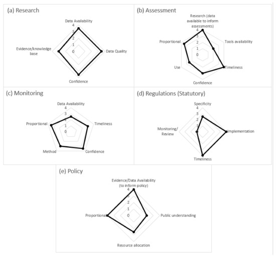 Policy, as a whole, scored relatively low (Figure 6e) because while there are policies in place and steps to increase the resource to support this industry from the government, there is little public understanding regarding the complexities of the environment and development that are required to be assessed and balanced by the regulators. Furthermore, policy development requires stakeholder engagement and public education on the marine environment and sectors as a whole, and there is no single approach or “quick fix” to resolve this.