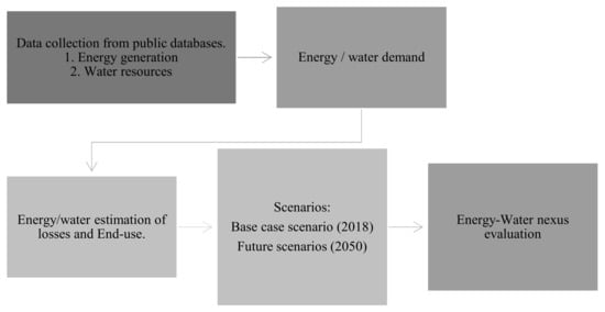 In the first step, data related to energy consumption and water resources have been retrieved from different sources [42,43] and preprocessed. In the second step, the contribution of each socioeconomic sector has been identified, and the calculations to obtain the energy and water demands, segregated by sector, have been performed, considering the relationship between water and energy. Then, the losses associated with each sector have been calculated to obtain the end-uses of water and energy, considering the particularities of each sector and process. Finally, the associated carbon emissions from all the processes under study have been obtained. With all the information retrieved from the previous steps, Sankey diagrams for each of the studied scenarios have been constructed. The following subsections describe each of these steps.