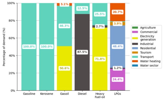 The demand for fossil fuels by sector can be partially obtained from the original sources. In general, fossil fuels have well-defined roles and are used in energy systems (see Appendix B for more details). Gasoline and gasoil are primarily used in land transportation. Kerosene is only used for air transportation, and maritime transportation relies on the use of heavy fuel oils and gasoil. Diesel is primarily used in industrial processes and in small-scale maritime transportation. The larger heterogeneity of uses is probably encountered in LPGs because they are versatile energy carriers and can be used in several applications, such as land transport, building and water heating, and cooking. Figure 2 shows the demand share of each sector in Tenerife divided by the fuel. As can be observed, the largest demand for fossil fuels is for transport.