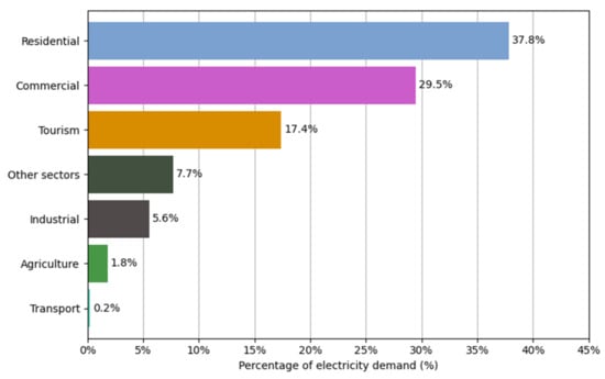 In our case, energy data were directly obtained from [43]. Data preprocessing was not necessary because data from the source were readily available for the year of interest. The relevant energy data are presented separately as the energy data corresponding to the different water processes. The energy demand for water heating is detached from their respective sectors (mainly residential, tourism, and commercial) to evaluate the overall impact of this action on the energy–water nexus.