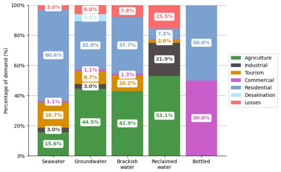 As mentioned in the previous sections, the latest freshwater data available for the Tenerife date from 2012. Hence, the water demand for 2018 must be calculated. To do so, the total water demand in 2012 has been scaled, according to the growth in population in 2018 [50], and the share of demand of each sector has been maintained as constant because there have not been significant changes in the socioeconomic environment or the water infrastructure of the island in recent years. In Figure 4, the share of demand for each source of fresh water is shown.
