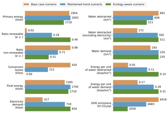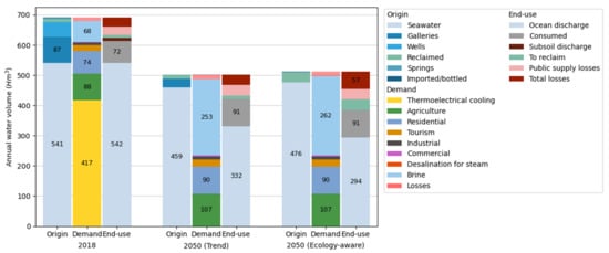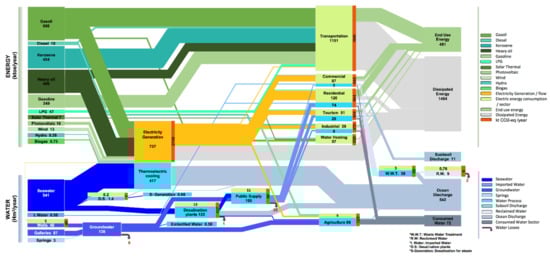 Additionally, losses generated by the transport of water and losses associated with the generation and transport of electricity have been analyzed, including the treatment and discharge of water, and the associated carbon emissions into the atmosphere of every process. This study uses an interesting visualization tool to expose the results of this kind of analysis: Sankey diagrams [39]. Using as a start point the current evaluation of the water-energy nexus of the island, the present study also evaluates the two different scenarios of the energy–water nexus that we understand should be included in this kind of analysis for 2050: a maintained trend scenario and an ecology-aware scenario.