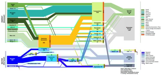 The efficiency and loss coefficients associated with each sector were obtained from [19], in which the authors estimated an average efficiency of 21% (79% losses) for the transport sector; 65% efficiency (35% losses) for the residential, commercial, and tourism sectors; and 20% efficiency (80% losses) for the industrial sector [19]. For water processes, the overall energy efficiency was estimated to be approximately 30% (70% losses). Therefore, the energy used for each sector was calculated using the following formula: