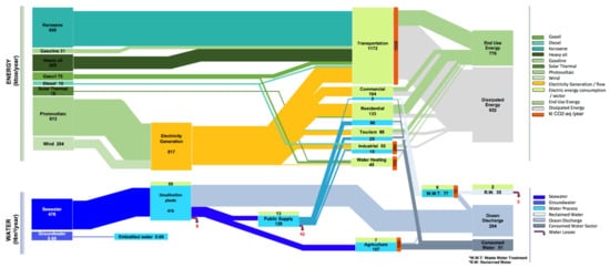 Figure 7 shows the Sankey diagram for the ecology-aware scenario. It can be observed how fossil fuels only flow to transportation (only air and maritime) and industrial sector, in comparison with the diagrams depicted in Figure 5 and Figure 6, where fossil fuels were present in the electricity generation. In this scenario, seawater is considered as the only source of freshwater.