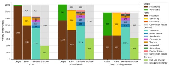 In Figure 8, the first bar represents the origin of energy (renewable or fossil fuels). The second bar represents the utilization of this energy, including conversion losses. The difference between the primary energy demand and conversion losses is the final energy demand of the island. The third bar represents the sectored demand for energy. The last bar represents the amount of energy that has been utilized as intended (end-use energy) and dissipated energy.