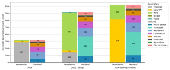 The ecology-aware scenario describes an optimistic scenario where the energy mix is 100% renewable, with a distribution of 25% wind and 75% photovoltaic sources. This scenario considers 100% electrification of land transport. The only remaining sectors that rely on fossil fuels are maritime and air transportation, as well as a minimal contribution to industry due to operational reasons. The use of GLPs is explicitly forbidden in this scenario (both for cooking and heating), and the energy demand supplied by them will be supplied by electricity. The diesel used to heat water in the tourism sector has been replaced with electricity and solar thermal energy.