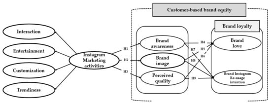 Brand equity, from both an academic and managerial perspective, is one of the most crucial constructs within the field of brand management [37]. Traditionally, brand equity is defined as the sum of assets and liabilities associated with a particular brand, including its logo and name, and is considered a core asset for maintaining a corporate competitive advantage [38]. Brand equity can also refer to a customer’s subjective and intangible evaluation of a brand [39]. Despite this being the case, scholars have different views of the sub-constructs of brand equity; it is widely accepted that brand equity is a multi-dimensional concept that includes brand awareness, brand image, perceived quality, and brand loyalty [38,40,41]. Further, customer-based brand equity can be treated as a hierarchical structure that assumes associative and directional relationships across the four dimensions of the construct, including brand awareness, brand association, perceived quality, and brand loyalty [38,42]. Therefore, in this study, brand awareness, brand image, and perceived quality were set as antecedents to brand loyalty, and the directional relationship between the four dimensions of customer-based brand equity and Instagram marketing activities was investigated as a whole.
