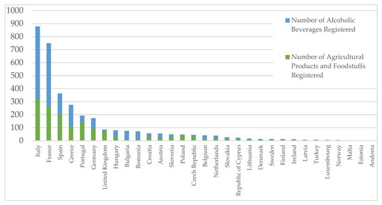 Through these logos (Table 1), agricultural producers can communicate the product’s characteristics and quality attributes to consumers, thus ensuring fair competition, intellectual property rights, and an integrated internal market [10,11]. Consequently, the main benefits for consumers are identified as follows: producers of agri-food products certified with quality schemes are required to provide reliable information on the origin of their products. They must guarantee that the products are authentic goods, not fakes or imitations (confirmed to the final consumer by the logo attached to the product packaging and charging a higher price than other foods in the same category). Thus, by purchasing certified agri-food products, the consumer can recognize products from their region or other regions [12,13]. In Europe, there are numerous agricultural products and alcoholic beverages certified with European quality schemes. The table below (Table 2) provides an official statistic containing the number of products registered and protected with quality schemes from each country. The first position is occupied by Italy. Figure 1 shows the situation of PDO/PGI/GI/TSG products by country in descending order (status—registered, all application type).