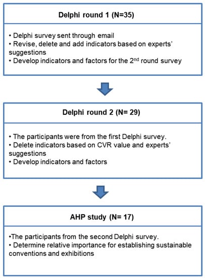 This study employed the Delphi and AHP approaches to identify indicators for the continuity of regional C&E efforts and their corresponding relative importance. First, based on existing studies, initial items were identified to develop indicators for sustainable C&E events that can maximize the competitiveness and long-term continuity of C&E [1,7,8,10,26,27,28,41,42]. The initial questionnaire was designed through extensive discussion among seven experts in C&E fields.