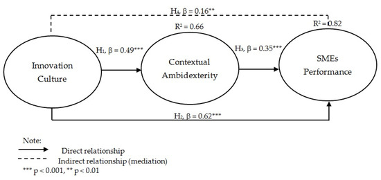 The findings show that a significant direct relationship exists between innovation culture and SMEs performance. On another note, contextual ambidexterity mediates the relationship between innovation culture and SMEs performance. Specifically, the results of the analysis for the direct relationship of an innovation culture and SMEs performance were significant (β = 0.62, p < 0.01), and the indirect relationship through contextual ambidexterity was significant as well (β = 0.16, p < 0.01) (see Table 6). Accordingly, significant direct and indirect relationships indicate that contextual ambidexterity is able to act as a mediator in the relationship between innovation culture and SMEs performance. Therefore, H4 in this study is supported. The overall conceptual model of the role of contextual ambidexterity as a mediator in the relationship of innovation culture and SMEs performance is illustrated in Figure 1.