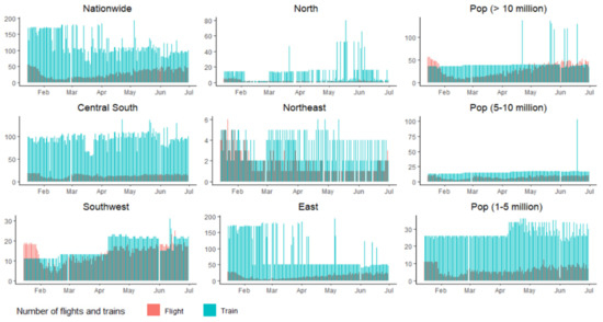 All data analysis was based on the panel data of 97 cities covering 15 January–30 June 2020. Figure 2 illustrates the total daily HSR trips and the number of flights in each region and among different cities. It is visible that the number of both HSR trips and flights began to reduce significantly at the end of January 2020. Specifically, as the total number of new daily COVID-19 cases surged in Wuhan and other cities, the service frequency of aviation, in particular, experienced a substantial decline.