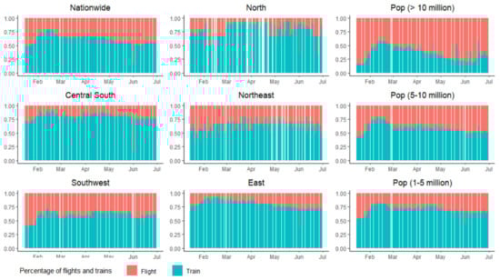 Given that the impact of COVID-19 on HSR and aviation systems is likely to vary in regions and cities with different population sizes, our assessment was also conducted in sub-groups by region and population size. Specifically, in addition to the national level analysis, we also conducted an assessment with a focus on the following six regions: the northeast, North, Central and South China, east, northwest, and southwest. In terms of population size, the cities were classified into three groups, including major metropolitan cities with more than 10 million, provincial capitals and other major cities with a population ranging from 5 to 10 million, and medium and small cities with a population range between 1 and 5 million. Such a classification enables us to capture the heterogeneity of various regions and cities with different population sizes. In any given sub-group, each sample represents a city pair of which both the origin and destination cities are from this sub-group.