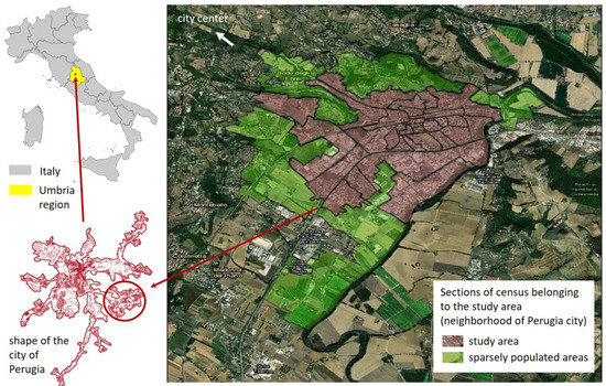 The study area is a densely populated neighborhood of Perugia (a medium-sized municipality in central Italy), covering a surface of 475.5 ha and located at the end of one of the built-up branches of the city (Figure 1).