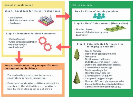 Our method consists of six steps: (1) public dataset collection concerning weather data, pollution concentrations, and urban morphology; (2) participatory training meetings involving citizens; (3) definition of the plots object of field research; (4) data collection of urban greenery by citizens; (5) ecosystem service assessment; and (6) development of a geo-specific tool for supporting (6.1) tree-planting decisions to enhance ecosystem services provision and (6.2) economic evaluations differentiated by species in the definition of taxations linked to trees damaged or cut down (Figure 2).