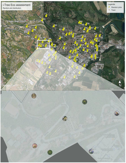 (3) The whole surface of the study area is 475.5 ha. To facilitate the data collection for homogeneous urban contexts, i-Tree Eco suggests randomly selecting plots inside the study area to perform field research. We selected 100 randomly located 0.4 ha plots, using a software function developed to this aim (Figure 3).