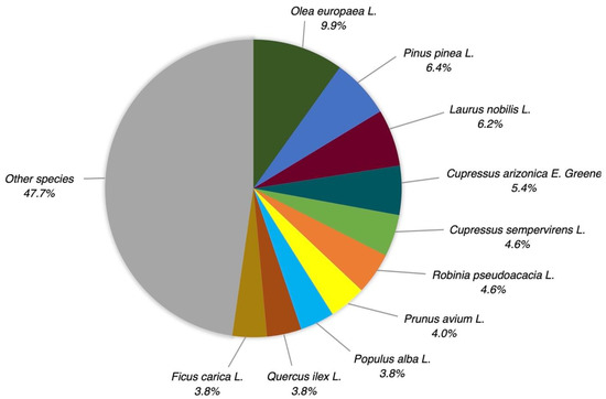 The studied trees belong to 57 species. The most common species are Olea europaea L. (9.9%), Pinus pinea L. (6.4%), and Laurus nobilis L. (6.2%) (Figure 4).