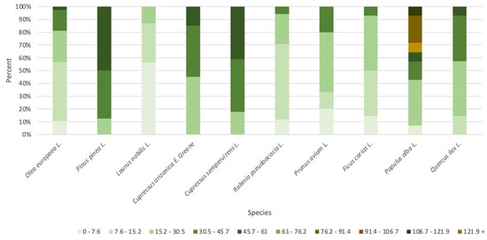 The majority (around 70%) of the trees are less than 30.5 cm DBH. The most common species have >50% of their trees with DBH less than 30.5, except for Pinus pinea L., Cupressus arizonica E. Greene, Cupressus sempervirens L., and Populus alba L., which have more large trees (Figure 5). During the field research, researchers and citizens also analyzed the shrubs. Supplementary Materials B (Sheet 2) reports the complete list of the 82 species (57 trees and 25 shrubs). The dominant species in terms of leaf area are two shrubs, Hedera helix L. and Rubus ulmifolius Schott., followed by several tree species.