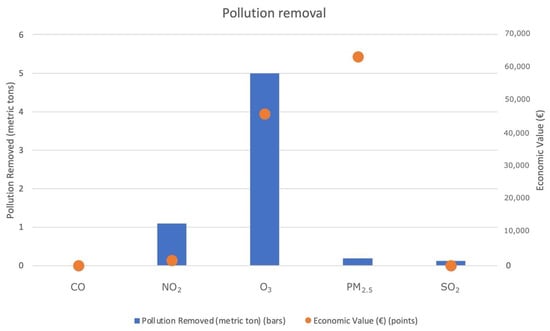 The inventoried 373 trees (Supplementary Materials B, Sheet 1) removed 46.2 kg of air pollution (O3, CO, NO2, PM2.5, and SO2) in 2019, with an associated value of EUR 748. Gross sequestration by studied trees is 2635 kg per year with an associated value of EUR 423, while trees have stored 63,806 kg of carbon (EUR 10,252). Populus alba L. has the best performance in carbon storage and sequestration (approximately 18% of the total carbon stored and 14.7% of all sequestered carbon) of the sampled species. The inventoried trees have reduced runoff by 88 m3 in 2019, with an associated value of EUR 169. In total, the 373 trees allow yearly saving of EUR 1291. Then, we have used i-Tree Eco to estimate the ecosystem services provided by the whole urban forest of the study area (Supplementary Materials B, Sheet 3.) Overall, i-Tree Eco estimated in the study area 40,680 trees (Standard Error 17%, ±6920 trees). The urban forest removed an estimated 6.46 metric tons of air pollution (O3, CO, NO2, PM2.5, and SO2) in 2019, with an associated value of EUR 111,000. Pollution removal is most significant for ozone (Figure 6), with 5 metric tons removed for a value of EUR 46,000.