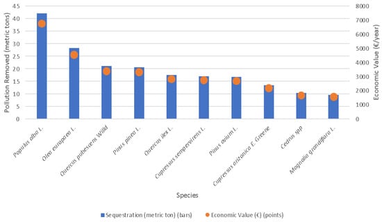 The gross sequestration by urban forest was 287.2 metric tons per year with an associated value of EUR 46,100 (Figure 7). Net carbon sequestration in the urban forest is about 243.7 metric tons. Trees are estimated to store 6960 metric tons of carbon (EUR 1.12 million). Populus alba L. stores and sequesters the most carbon (approximately 18% of the total carbon stored and 14.7% of all sequestered carbon) of the sampled species.