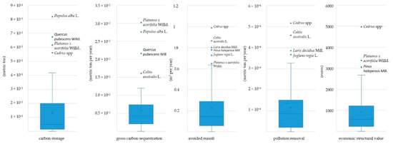 In the case study, the tree species with the higher performance in carbon storage are Populus alba L. (0.8184 metric ton per tree), Quercus pubescens Willd. (0.6740), Platanus x acerifolia Mill. (0.6161), and Cedrus spp. (0.5614). Other studies in Italy [34] confirm these species as a very effective carbon sink. Platanus x acerifolia Mill., Populus alba L., Quercus pubescens Willd., and Celtis australis L. are the best for carbon sequestration. The tree species with an amount of yearly avoided runoff higher than 0.7 m3 per tree are Cedrus spp. (0.9882 m3/year), Celtis australis L. (0.8643), Larix decidua Mill. (0.8007), Pinus halepensis Mill. (0.7789), and Juglans regia L. (0.7278). There is not much literature on the ranking of the best-performing trees for avoided runoff in urban areas, so new studies should be carried out from this perspective. Indeed, many studies report overall evaluations for the urban forest [7,19] and are not differentiated by species. Trees with the best performance in pollution removal are Cedrus spp., Celtis australis L., and Larix decidua Mill, which remove more than 0.3 × 10−4 metric tons of pollutants from the air yearly per tree. Thanks to their wide leaf area and roughness, they are excellent in pollution removal. The coniferous trees such as Cedrus spp. and Larix decidua Mill. also perform well thanks to the annual persistence of leaves on the plant [63], particularly for PM2.5 [64]. These results depend on the composition of the inventoried species, climate characteristics, and urban morphology.