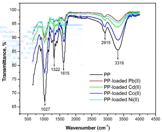 The FT-IR spectra of dried pitahaya peel before and after contact with Pb(II), Cd(II), Co(II), and Ni(II) are presented in Figure 2. The broadband located at 3315 cm−1 suggests the presence of hydroxyl groups on the surface of the pitahaya peel []. The band at 2916 cm−1 can be assigned to (–CH2) and (–CH3) vibrations of aliphatic groups []. The strong band observed at 1615 cm−1 is related to the C=O functional group, which can be linked to ester or/and carbonyl groups []. The bands found at 1322 cm−1 and 1027 cm−1 can be associated with C–O stretching vibrations in phenolic groups [,]. According to previous studies, carboxyl and hydroxyl functional groups are mainly responsible for heavy metal biosorption from aqueous solutions, since they provide active sites for surface complexation with metal ions, for an ion exchange process, or for a combination of both as a principal interaction between the functional groups and metal ions [,,].