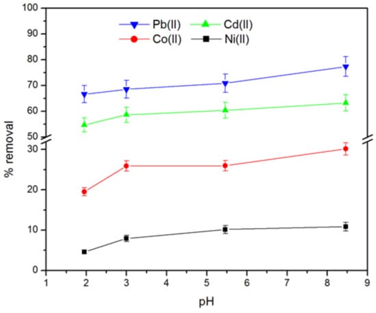 We decided to perform the experiments at a pH slightly lower than the point of zero charge, so as to avoid the phenomena of precipitation in the case of all the studied metal cations and so that the initial pH would be the same for all the experiments. This does not mean that at this pH, the adsorption extent would be blocked. On the contrary, the recorded and reported removal efficiencies can be further enhanced by optimizing the pH (initial or final). A similar approach was followed previously [], it was found that even at a pH close to and below the point of zero charge, the adsorption ability was almost the same and high when the experiments were performed at a pH slightly above the pHPZC.