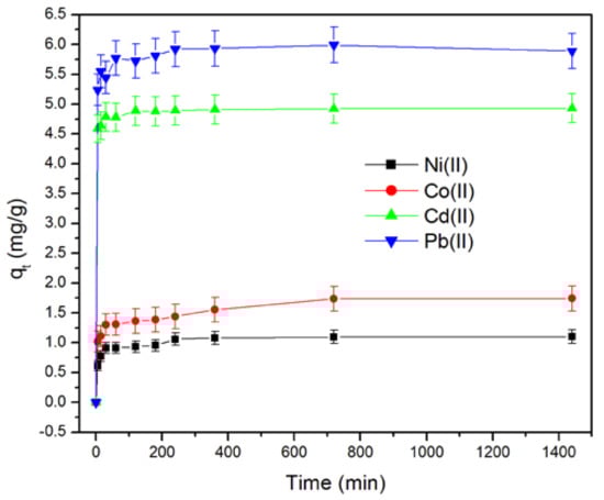 Figure 5 shows the amount of metallic ions sorbed per gram of pitahaya peel from aqueous solutions as a function of contact time. It can be observed from this figure that more than 80% of Pb(II), Cd(II), Co(II), and Ni(II) are removed within the first 30 min, revealing fast kinetics at the initial stage. As time increases further, the removal extent increases but to a lesser extent. The high uptake of heavy metal ions in a short time after contact with pitahaya peel is considered one of the most critical advantages of the biosorption technique from the economic wastewater treatment point of view. Similar kinetic behavior has been reported in other studies, in which it was found that the equilibrium time depends on the metal ions and agricultural waste types [,].