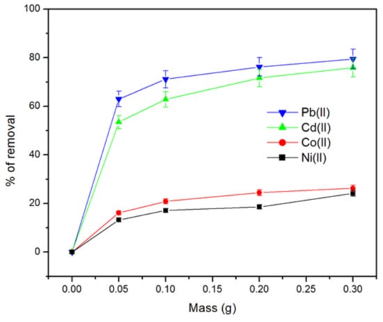 Figure 6 shows the effect of PP mass on the removal of Pb(II), Cd(II), Co(II), and Ni(II). It can be observed that the percent removal of metals ions increases with increasing biosorbent mass. As shown in Figure 6, when the PP mass increases from 5.0 to 30.0 mg/L, the percent removal increases from 63–79%, 53–75%, 16–26% and 13–24% for Pb(II), Cd(II), Co(II) and Ni(II), respectively. Similar behavior was reported by other researchers, which can be attributed to the increase in surface area available for sorption [,].
