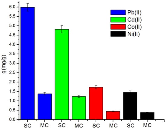 Comparison of sorption capacity of heavy metal ions from single- and multi-component solutions. (SC and MC, respectively). Mass of biosorbent = 0.1 g, ambient temperature, initial concentration of metallic ions = 100 mg L−1, pH = 5.5, and contact time = 24 h.