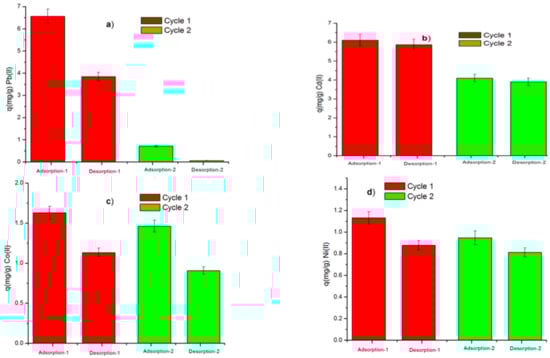 The reuse of biosorbent materials is useful to evaluate the cost-effectiveness of these materials for the treatment of industrial wastewater [,,]. Two consecutive adsorption–desorption experiments in batches were carried out in this work. As shown in Figure 10, the sorption of metal ions decreases from the first to the second cycle. The amounts of Pb(II), Cd(II), Co(II), and Ni(II) sorbed in the first and second cycles were 6.56–0.71 mg/g, 6.107–4.102 mg/g, 1.630–1.462 mg/g, and 1.131–0.813 mg/g, respectively. Similar results were reported in previous studies, in which the decrease of the sorption capacity of the biosorbent was attributed to the irreversibility of metal ions previously adsorbed in the prior cycle []. Desorption efficiencies of Pb(II), Cd(II), Co(II), and Ni(II) in the first and second cycle were 58.60–8.95%, 69.40–61.98%, and 77.50–85.84%, respectively. This result confirms the efficiency of HCl (1 M) as a metal desorbing agent by removing bound metal ions from active sites on the surface of the biosorbent [].
